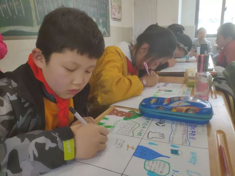 临近活动结束,甄洋、韩东晓同学给孩子们分发了水彩笔,希望他们能够动手设计手抄报,记录下自己对土壤的了解,孩子们都十分开心,用心绘制着手抄报。