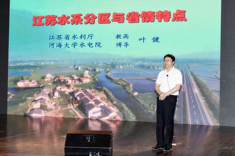 叶健教授为本次“农情河海”学术论坛做“江苏水系分区与省情特点”特邀报告。他以翔实的数据、科学的分析,全面、系统、深入地介绍了江苏省分区水系分布和省情特点,以及江苏省水利和农业建设发展的情况。他指出江苏省80%的地面处于洪水的威胁之下,素有“洪水走廊”之称,因此防洪工程的建设也是江苏省水利的重中之重。叶教授的精彩报告赢得了在场师生的热烈掌声。