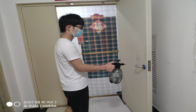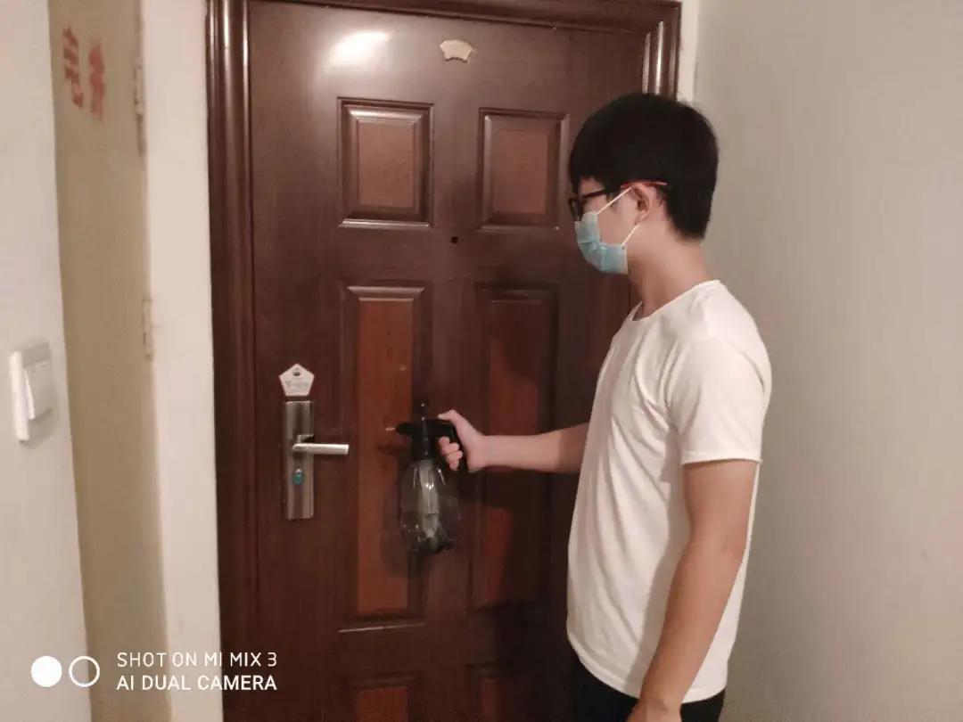 工作时张恒熙同学需戴着口罩并拎着消毒液,逐栋楼、逐个单元地进行消毒,不放过任何一个死角。同时,也要不断提醒居民加强防范,出门佩戴口罩、勤洗手、做好居家消毒。对楼道进行防疫消毒的工作还在继续,在疫情没有得到全面控制之前,社区防疫工作一刻也不会松懈。张恒熙相信只要万众一心、众志成城,一定能够打赢这场无硝烟疫情防控战。