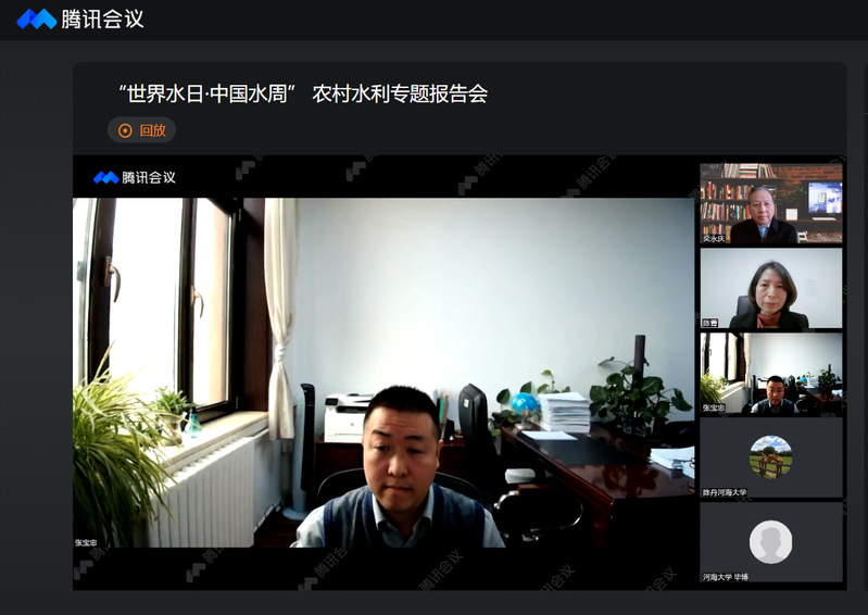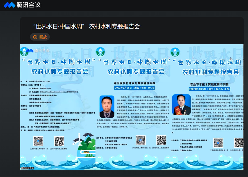 2022年3月25日,由江苏省水利学会农村水利专业委员会、江苏省灌区联盟、威廉希尔中文网站平台联合主办的“世界水日·中国水周”农村水利专题报告会,通过腾讯会议和线上直播的方式隆重举行。会议邀请了全国“百篇优博”和国家自然科学基金“优青”项目获得者、中国水利水电科学研究院水利所副所长张宝忠教授级高级工程师,以及全国劳动模范、国际节水技术奖获得者、河海大学兼职教授、浙江省余姚市水利局原总工奕永庆教授级高级工程师作专题报告。江苏省水利厅农村水利与水土保持处沈建强处长出席会议并致辞。农村水利专业委员会专委会主任、河海大学威廉希尔中文网站平台院长陈菁教授主持会议并作会议总结。