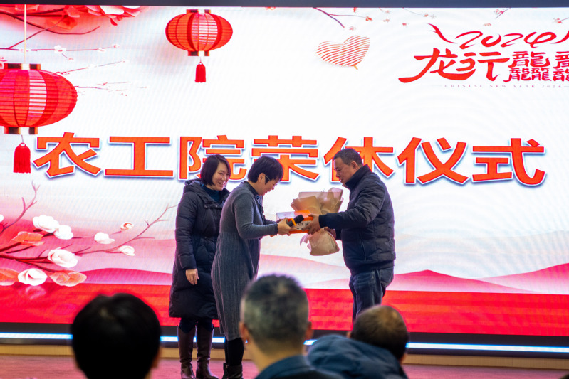 联欢会上增加了荣休仪式环节,主持人宣读退休教师陈毓陵和张齐兴两位老师的个人简介,徐俊增院长发表感谢致辞,代表学院衷心祝愿两位老师心情舒畅、荣休快乐,郑润副书记和张洁院长为陈毓陵老师献花并送上荣休礼物,最后冯建刚老师代表项目组为陈毓陵老师颁发荣休勋章。紧接着,牟童老师的一首《向天再借五百年》表达了对荣休教师们的依依不舍和深切祝福。