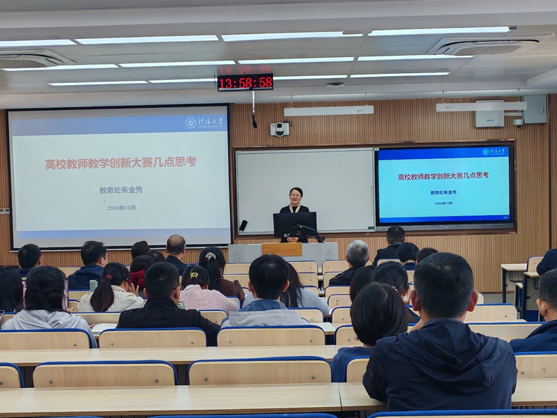 2024年10月25日下午,河海大学教务处副处长朱金秀教授受邀为威廉希尔中文网站平台教师做了《高校教师教学创新大赛几点思考》专题报告。报告会由副院长张洁教授主持,学院全体教师参加了报告会。