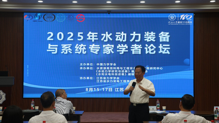 由中国力学学会主办,水资源高效利用与工程安全国家工程研究中心、《水动力学研究与进展》编辑委员会、《水利水电科技进展》编辑委员会共同承办,江苏省力学学会、江苏省水力发电工程学会协办的“2025年水动力装备与系统专家学者论坛”于2025年8月15日至17日在河海大学隆重召开。来自清华大学、浙江大学、武汉大学、中国农业大学、河海大学、哈尔滨工程大学、上海大学、宁波大学、江苏大学、扬州大学、华北电力大学、浙江理工大学、上海理工大学、西华大学、上海应用技术大学、浙江水利水电学院、中国船舶科学研究中心、中国南水北调集团东线有限公司、中国电建集团华东勘测设计研究院有限公司、中国长江电力股份有限公司、国电南瑞科技股份有限公司、哈尔滨电气集团有限公司、南京南瑞水利水电科技有限公司、南水北调东线江苏水源有限责任公司、江苏省水利勘测设计研究院有限公司、上海勘测设计研究院有限公司、上海市水利工程设计研究院有限公司、中国电建集团华东勘测设计研究院有限公司、东方电气集团东方电机有限公司、利欧集团湖南泵业有限公司、江苏航天水力设备有限公司、上海凯泉泵业(集团)有限公司、上海东方泵业(集团)有限公司、曲阜恒威水工机械有限公司、株洲南方阀门股份有限公司等相关企业、高校与科研单位的70多位专家和学者受邀出席了此次论坛。