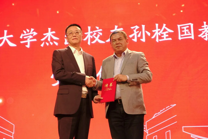 在激昂的国歌声中大会正式开始。第一阶段是“河海大学杰出校友孙栓国教授受聘仪式”。院党委陈毓陵书记为孙栓国董事长颁发河海大学教授聘书,佩戴校徽并合影。