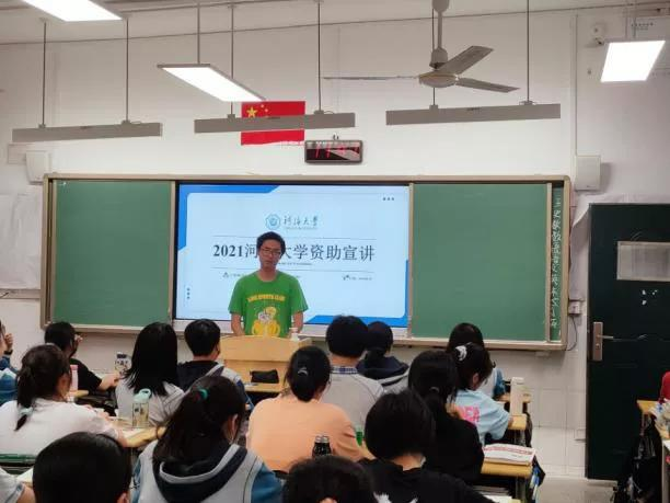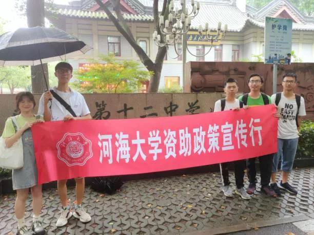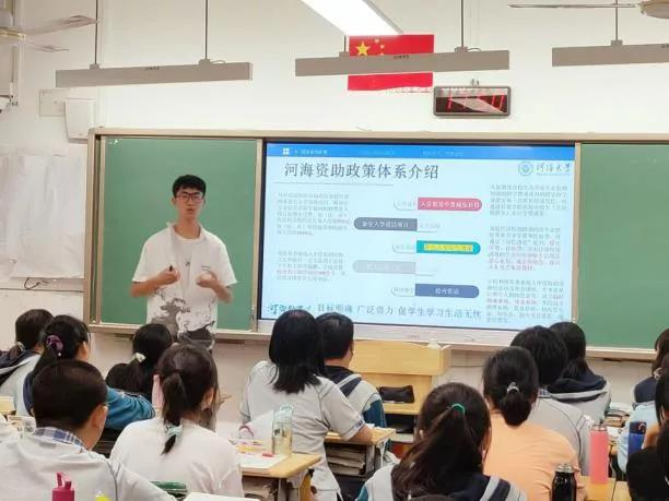 6月25日下午团队五人到达了南京市十二中,宣讲时,团队成员依次上台进行自我介绍后,刘国正、王琨同学布置宣讲会场,杜婧同学向所有在场的同学分发互动交流的信纸,宋昕宁和芦治宇同学分别为同学们讲解了国家资助政策以及河海大学的资助政策。