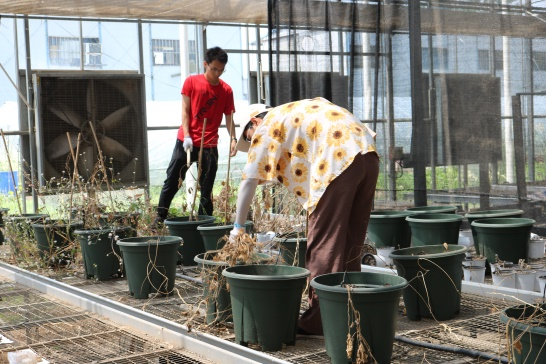 负责人讲述完相关要求后,同学们自主拿起工具和手套,分成两大组,一组同学负责清理左侧台架区的杂草,一组同学负责清理右手边盆栽区的杂草。