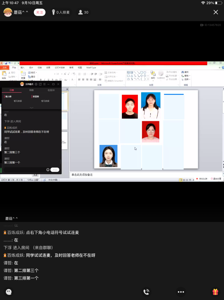 为增进同学间的感情,此次班会设计了精彩的破冰游戏环节,并采取积分制,奖励前三名同学。第一个项目是“看你们熟不熟”,这个环节旨在考验新同学之间的熟悉程度,同学们纷纷争抢开麦,因此班会紧张的气氛逐渐舒缓了很多,同学们开始变得放松,群里发言的同学不断。接下来依次进行的是“猜电影”、“看图猜成语”、“看图猜明星”、“看图猜车标”、“一站到底”一系列游戏,随着游戏的不断进行,班会的气氛也不断高涨,同学们也逐渐熟络了起来。