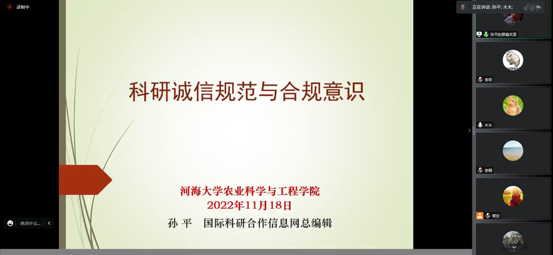 为加强科研诚信建设,加大科研诚信、学术规范的宣传教育力度,营造良好学术道德氛围,2022年11月18日下午,学院在江宁校区行政楼401室举办“学术规范和学术诚信”讲座,邀请国际科研合作信息网总编辑孙平博士为农工院全体师生作题为“科研诚信规范与合规意识”的报告,讲座由副院长徐俊增教授主持,采用线下与线上相结合的方式进行。